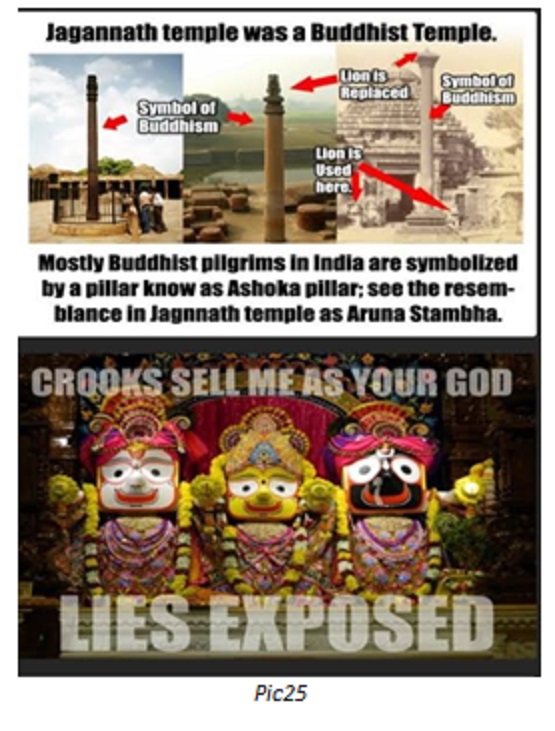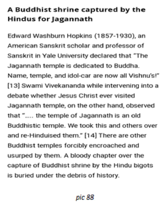 | 13 | THE SAGES OF INDIA’ IN THE COMPLETE WORKS OF SWAMI VIVEKANANDA, VOL. 3, ADVAITA ASHRAM, CALCUTTA | 1964 | SWAMI VIVEKANANDA | ADVAITA ASHRAMA | Swami Vivekananda, regarded as an icon by Hindutva politicians, was also a great narrator of ancient India. He unambiguously declared that Jagannath Temple was originally a Buddhist Temple. According to his admission: “To any man who knows anything about Indian history…the temple of Jaganath [sic] is an old Buddhistic temple. We took this and others over and re-Hinduised them. We shall have to do many things like that yet. " | Did Hindu Brahmins convert the Buddhist stupas, shrines and caves into Hindu temples and shrines like Balaji Temple and Sabarimala Temple? |
