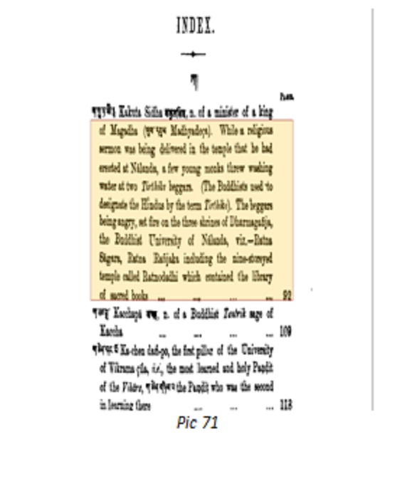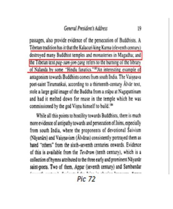 | 60 | SOCIETY AND CULTURE IN NORTHERN INDIA IN THE TWELFTH CENTURY | 2012 | B.N.S YADAV | RAKA PRAKASHAN | The Kalacuri King Karna (11th century) destroyed many Buddhist temples and monasteries in Magadha, and the Tibetan text Pag Sam Jon Zang refers to the burning of the library of Nalanda by some ‘Hindu fanatics | How history was made up at Nalanda |