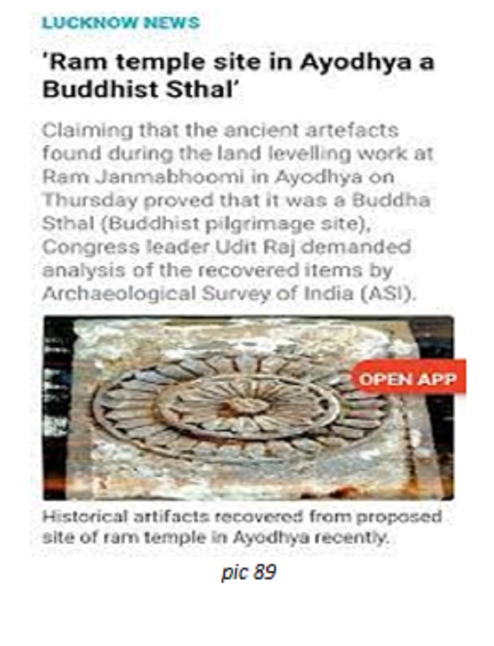 | 58 | AYODHYA KISKI?NA RAM KI, NA BABAR KI ('WHOSE AYODHYA? NEITHER RAM'S NOR BABAR'S') | 2011 | BALWANT SINGH CHARVAK | SAMYAK PRAKASHAN | This books shows that the Brahmin Pushyamitra Sangha murdered the last Mauryan king and came to power over much of northern India [ Images ], he let loose a virtual genocide of Buddhists, destroying many of their temples, including possibly the Buddhist vihar that Charvak claims was built on Lomash Rishi's hermitage | The Dalai Lama and Ayodhya |